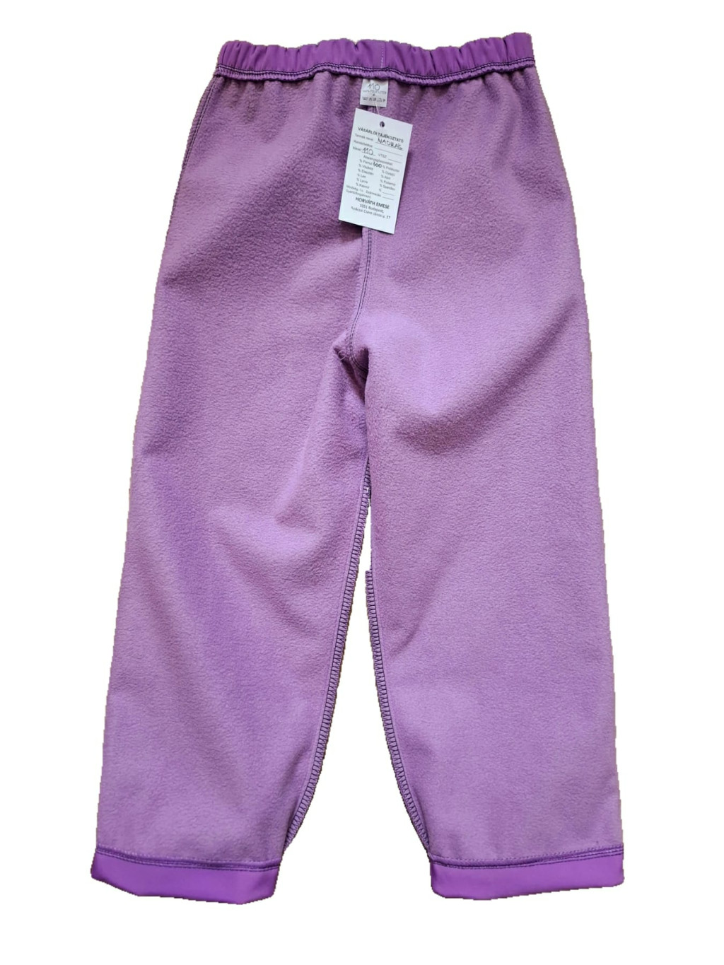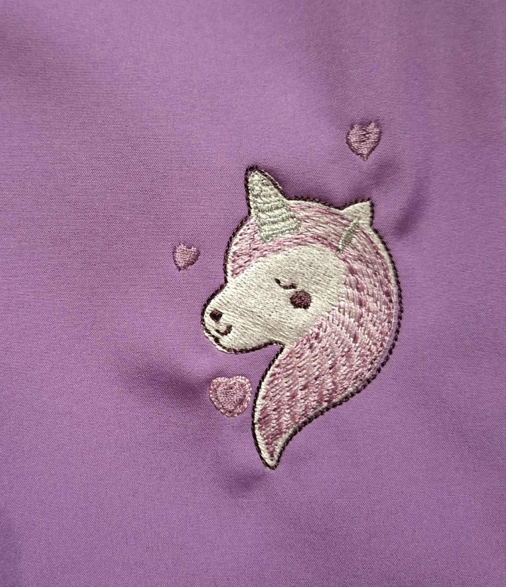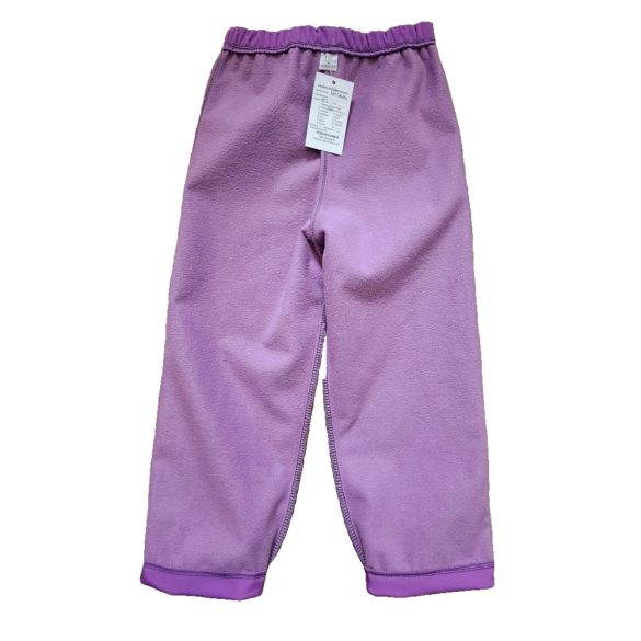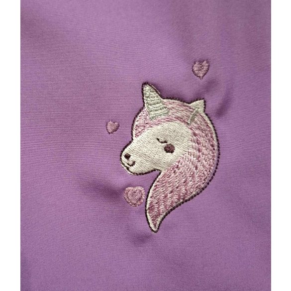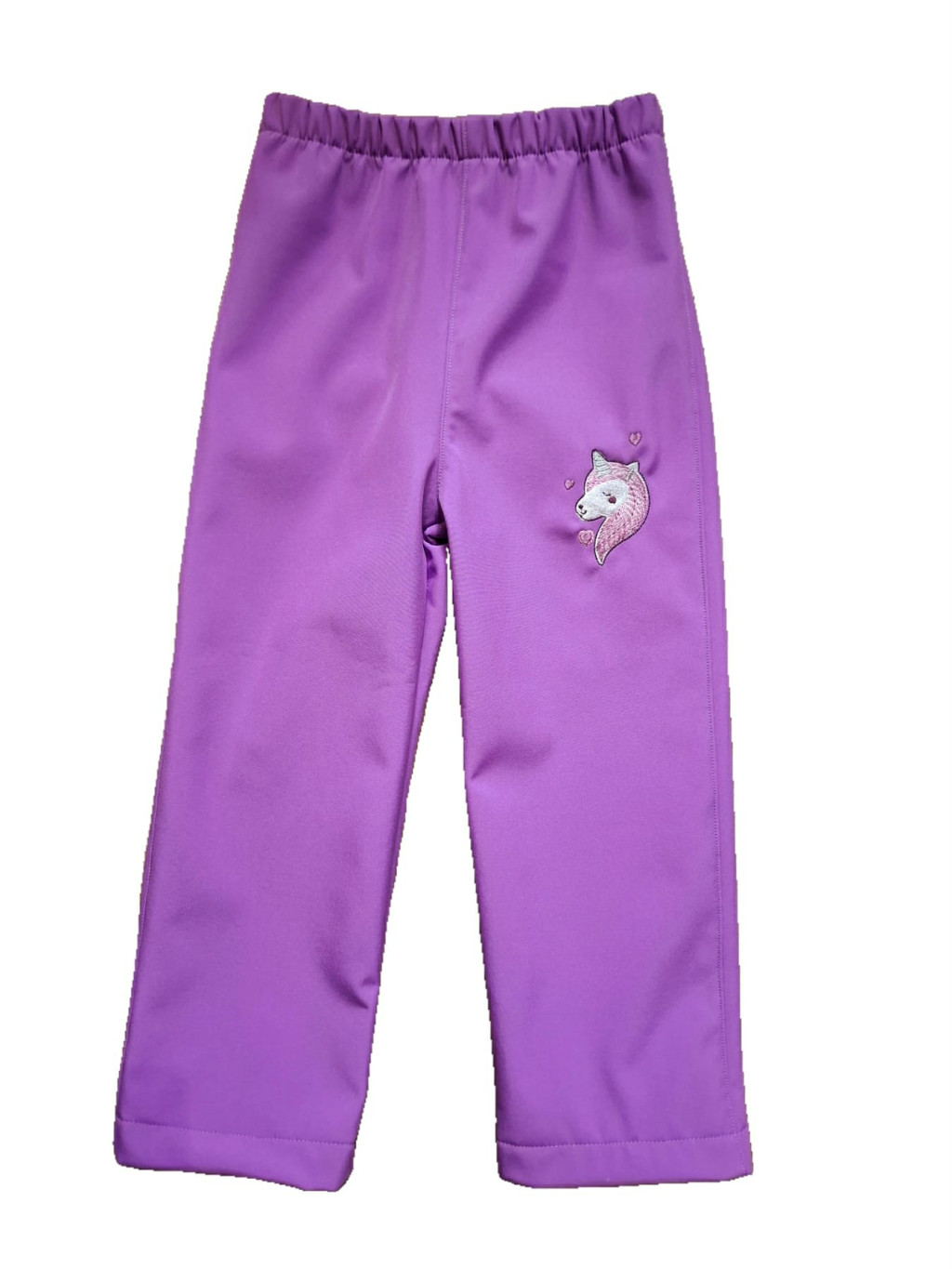 Egyedi shoftshell vízálló gyerek nadrág lila alapon unikornis hímzéssel.