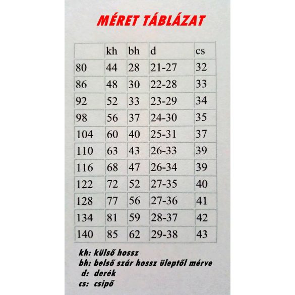 Kérlek minden esetben nézd a méretezést, mert nadrágjaink hosszú szabásúak, így akár több évet is hordhatóak!
