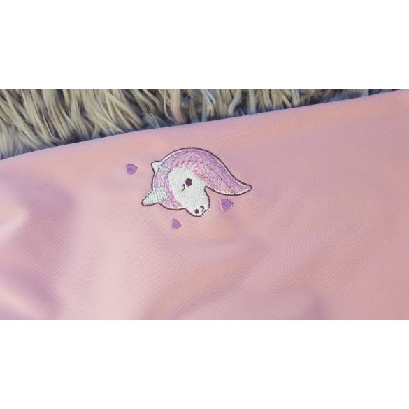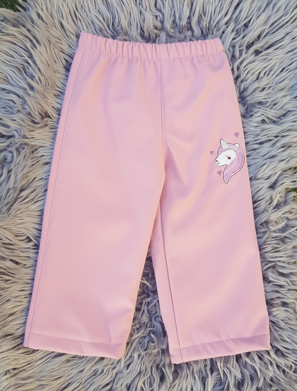 Egyedi shoftshell vízálló gyerek nadrág rózsaszín alapon unikornis hímzéssel.